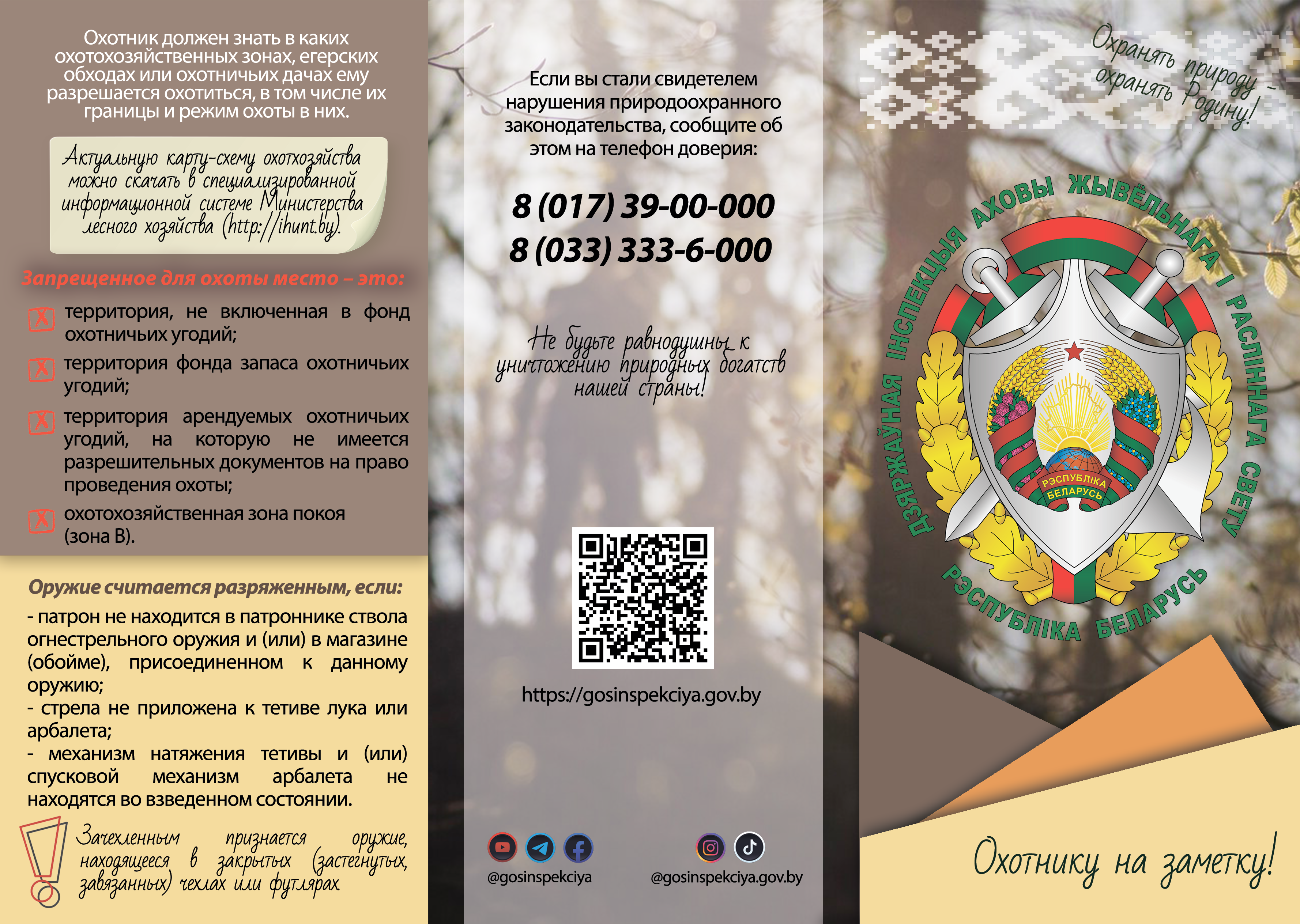 Областная инспекция охраны животного и растительного мира напоминает, если Вы располагаете информацией о совершенных, совершаемых или готовящихся фактах любых нарушений природоохранного законодательства, просим сообщить об этом на телефон «доверия» по номеру 8-0152-33-70-00 либо +375-33-364-33-36 (мобильный оператор МТС).