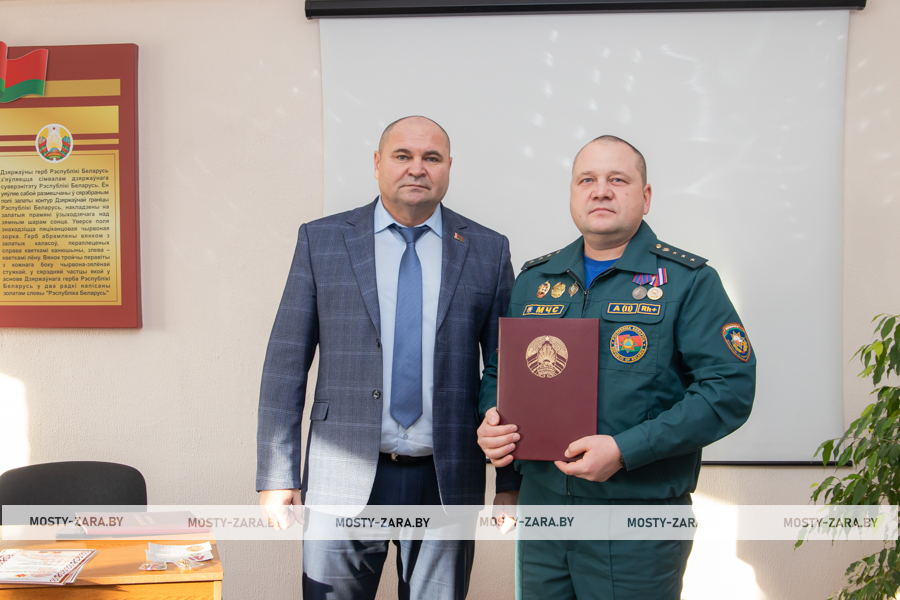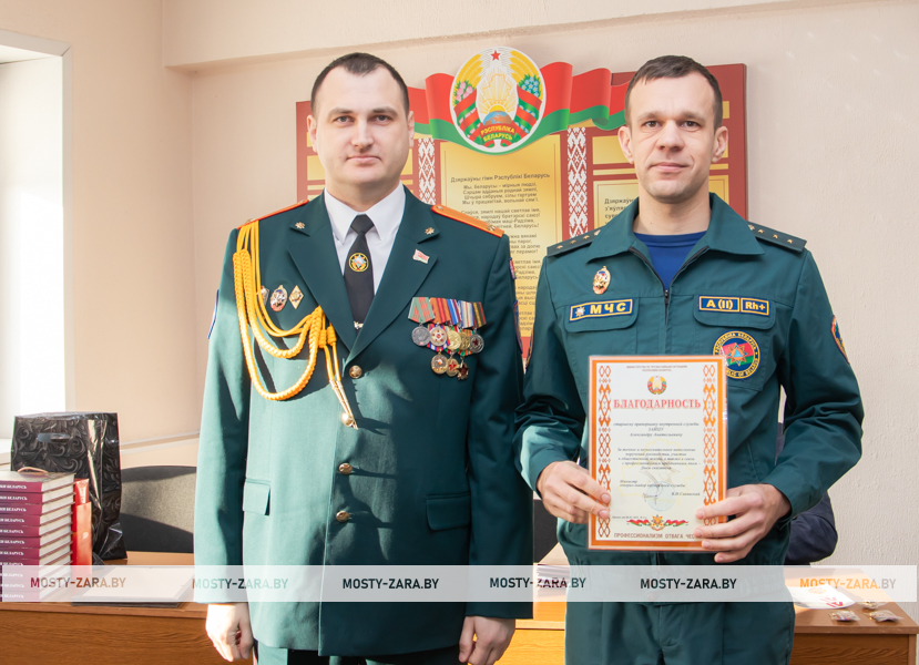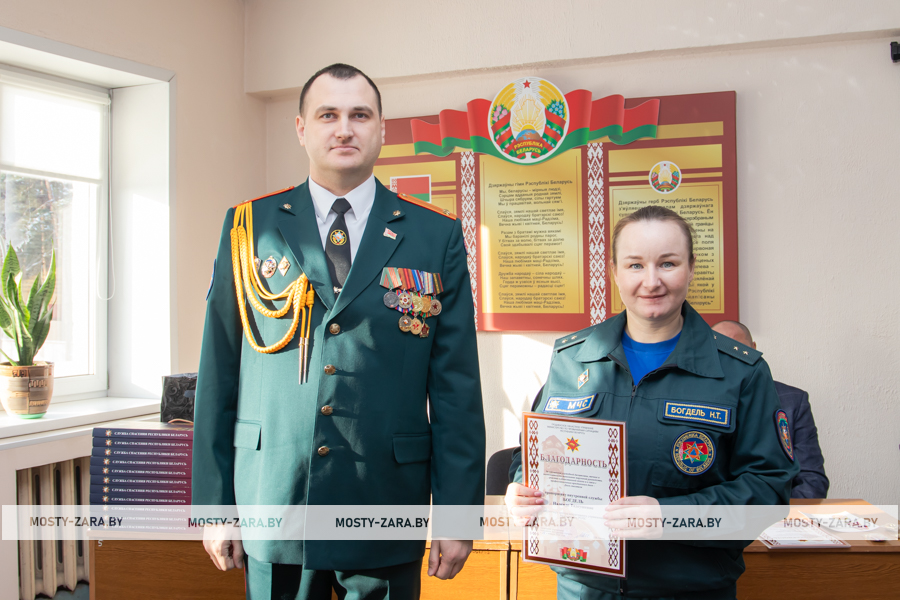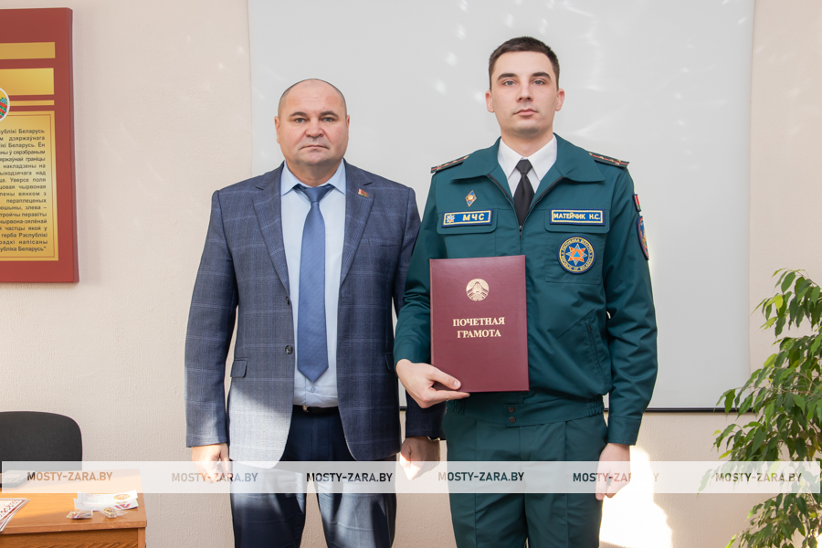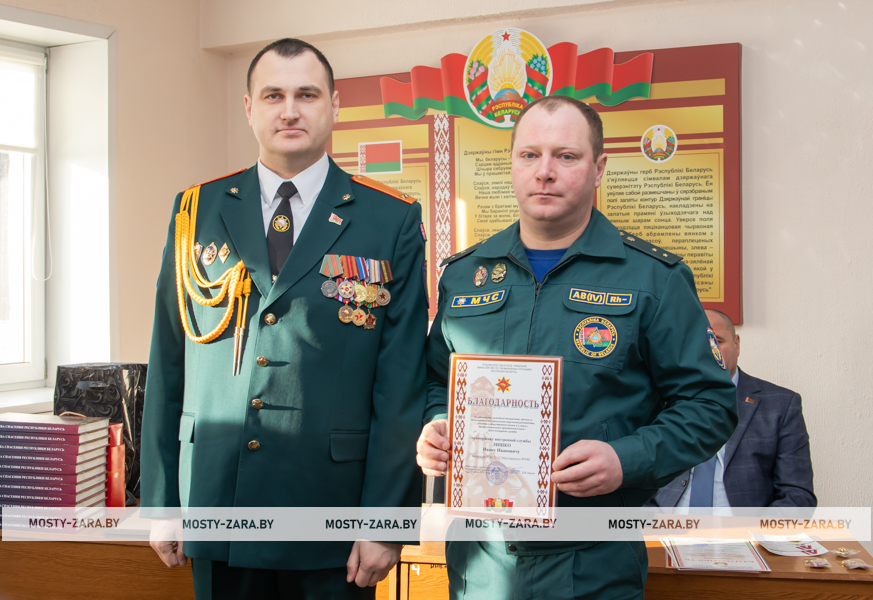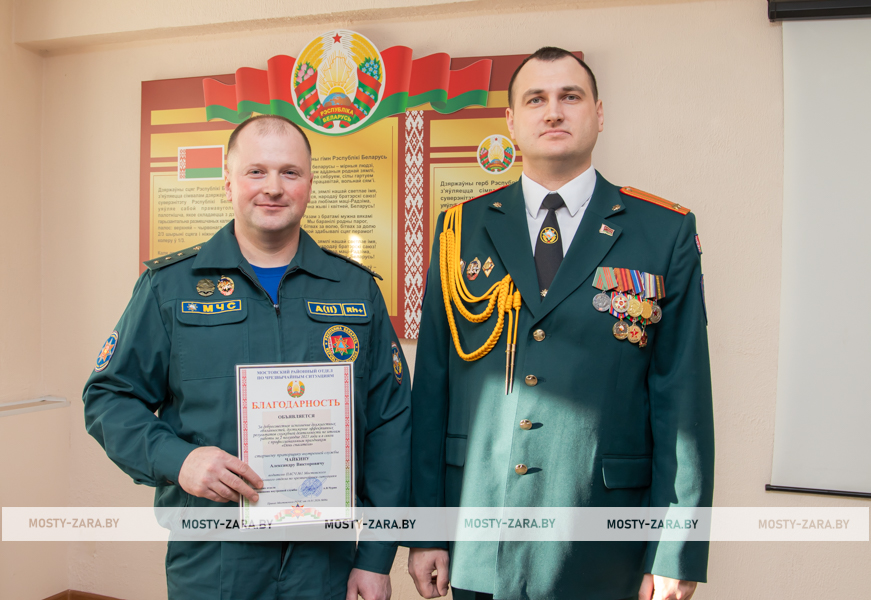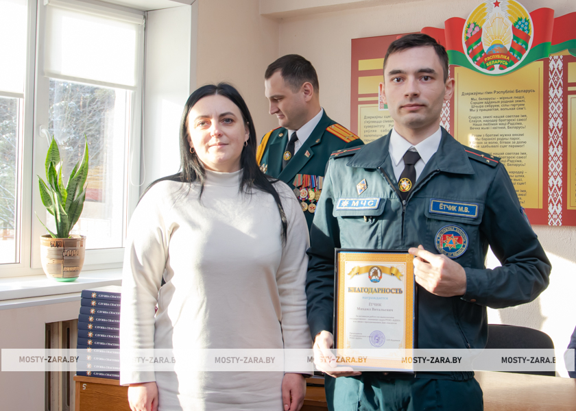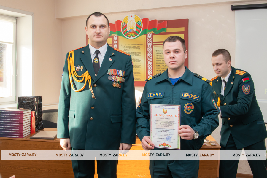 Благодарность начальник Мостовского РОЧС объявили старшему прапорщику внутренней службы Александру Чайкину, прапорщику внутренней службы Татьяне Янчене, старшему сержанту внутренней службы Владиславу Войцеховичу, сержанту внутренней службы Дмитрию Федутику.